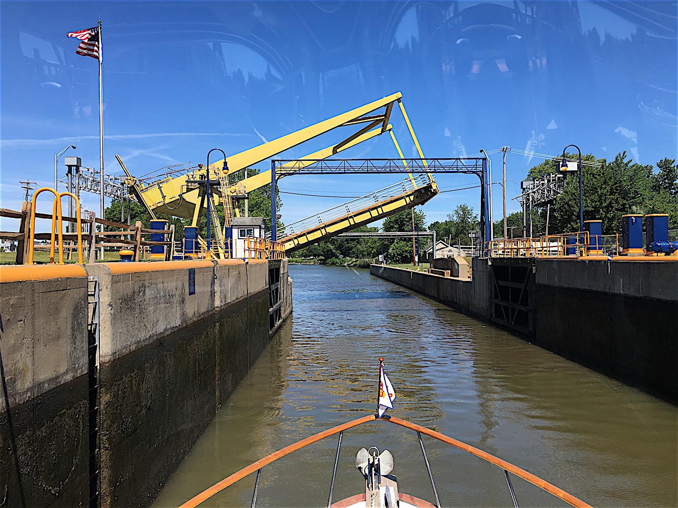Construction of the 524-mile long NY State Canal System started in 1817 and today consists of the Erie, Oswego, Cayuga-Senecca and Champlain Canals. (We only did the first 160 miles of the Erie and then turned north up the 24-mile Oswego.) The Erie Canal was the inspiration of Gov. DeWitt Clinton who took much abuse from opponents who called it “The Big Ditch Folly.” However, soon after it opened, the Erie Canal was such a success everyone jumped on the bandwagon to support it. It was built in an incredibly short 7 years, with 18 aqueducts and 83 locks that transported vessels 363 miles and elevated them 568’ from Albany on the Hudson River to Buffalo on Lake Erie. The canal, originally 4’ deep and 40’ wide where mules on the towpath beside the canal pulled boats along, has been enlarged 3 times to accommodate larger boats and more traffic. It was memorialized in the song,“15 Miles on the Erie Canal.”
