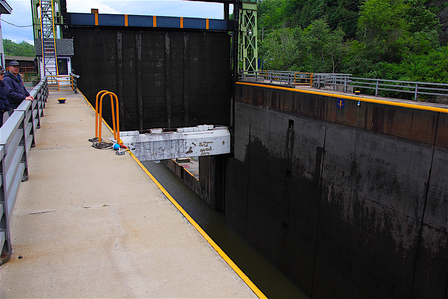 The next day, we completed Locks 7-13, all rising, for a total of 102’. In Lock 8, the lockmaster asked us to switch walls due to a mechanical difficulty, which went OK. Shortly afterward, muddy water poured into the lock. Then, upon opening the lock doors, only 1 door would open. He asked if we had enough room to get out, otherwise, we would have to wait until he could fix the problem. We assessed the opening and decided we thought it would be doable. We did not assess the current! Upon driving out, the turbulence slammed us into the starboard wall and we drug off 1 bumper and its nice $100 handrail bumper mounts, which broke away from the bumper ball to the bottom of the lock. We asked the lockmaster to give the ball to the next boat to drive through to return to us, but never got it back. We found out later that if a boat is delayed in a lock more than 15 minutes due to lock difficulties, the lockmaster has to fill out paperwork. Next time, we’ll wait!