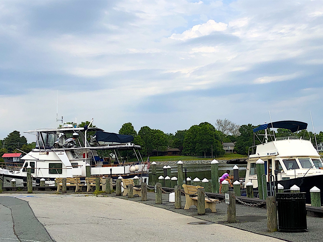 We used our Nebo app for the first time, a location service which tracked where we were, as well as logging speed, distance, and other information. (If you download this app, you could see exactly where Life’s TraVails is at any time.) We had heard there was a free city dock in Chesapeake City and we discovered through Nebo that Steve and Janice on Nomadic Spirit were tied up there. We texted to see if there was room for us, and by the time we got there, we got the last spot on the outside. They caught our lines for us. Unfortunately, our power cord was not compatible with the power pedestal there.