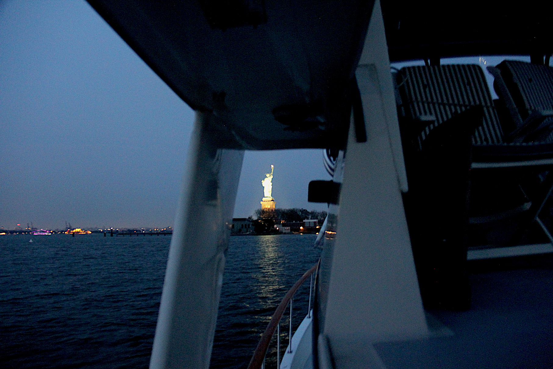 After a delicious dinner of salmon from the grill, we readied the boat for departure and prepped for our 4:30 AM wake-up. It was going to be a long open-ocean trip to New York City. It turned out to be uneventful with almost flat seas. We anchored right behind the Statue of Liberty, in between Ellis Island and Liberty Park. It had been our plan on our first Great Loop, but the trauma of that trip made us forget about it (read here). The view of the statue was amazing, but the lights after sunset lit up the city! Our real amazement came the following morning.