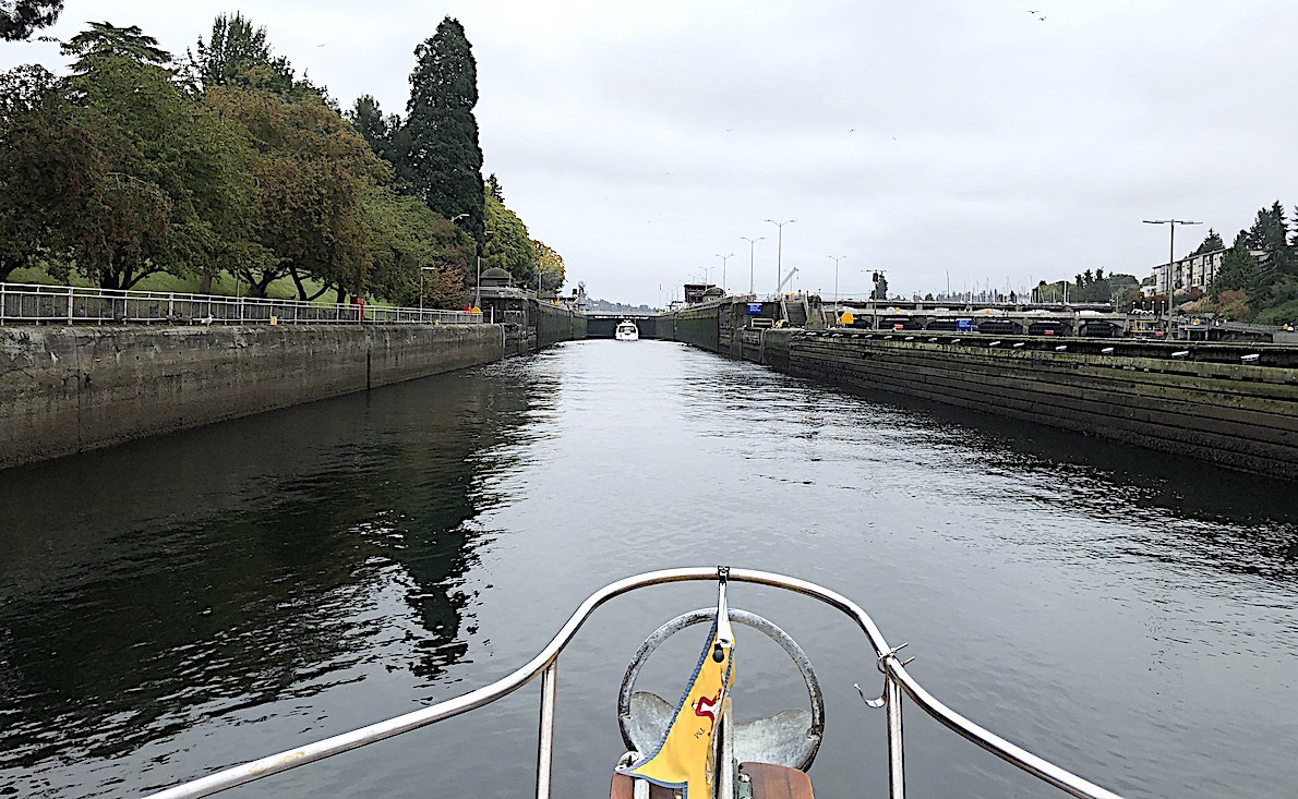 Day 1 began by moving the boat from Thomas Boat Repair to Fishermen’s Terminal  (10 min away) to pump out and clean the fuel-coated bilge (see previous blog), about a 3-hour project. Then we crossed the lake (another 10 minutes) to Covich-Williams and bought 464 gals of diesel at $2.75/gallon. You do the math. From there, we made a big move (15 minutes) to the Ballard Lock, where we had to wait an hour to lock down out of Union Lake to sea level on the Puget Sound. In long-sleeved shirts and fleece-lined raincoats, (plus an