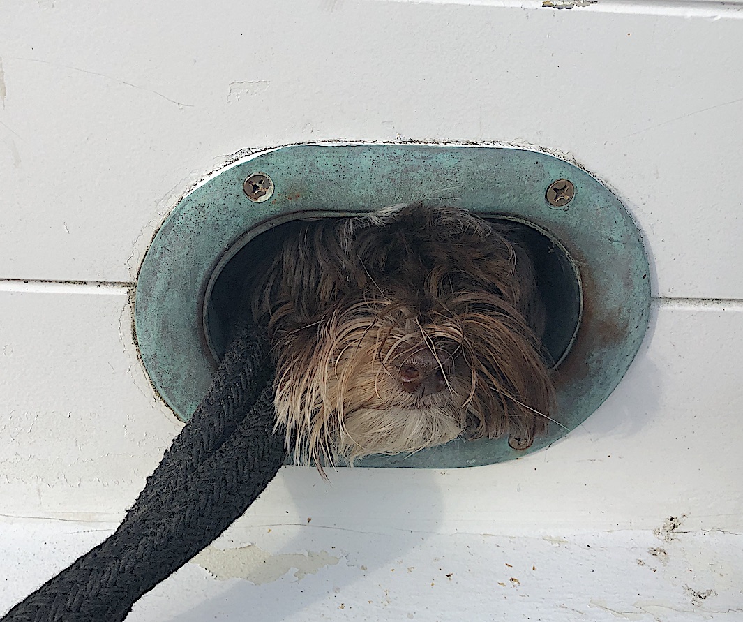 So, what did we do with Whisper when we are cruising?  First, she was always in her crate while we were anchoring or maneuvering in a marina, either on the flybridge or daybed behind the settee in the pilothouse. That way, there was no way she could be a distraction. For the first 2 days of cruising, she stayed in her crate with breaks for the potty, drinking water, stretching, or playing. On day 3 of moving, we decided to see if we could teach her to stay in her bed on the daybed. Prior to that, we had taught her the words “crate,” “bed,” and “lap.”  Paula worked with her for about 2 hours, correcting her whenever she pushed the limits. She did really well!  She was allowed to hang her front paws over the edge, but her body had to stay in the bed or behind the bed. (She could lie there and hang her head onto her bed.)
