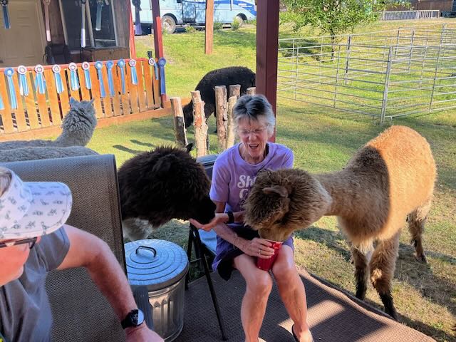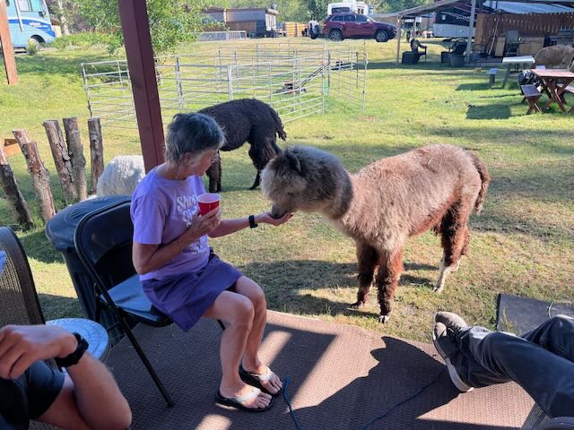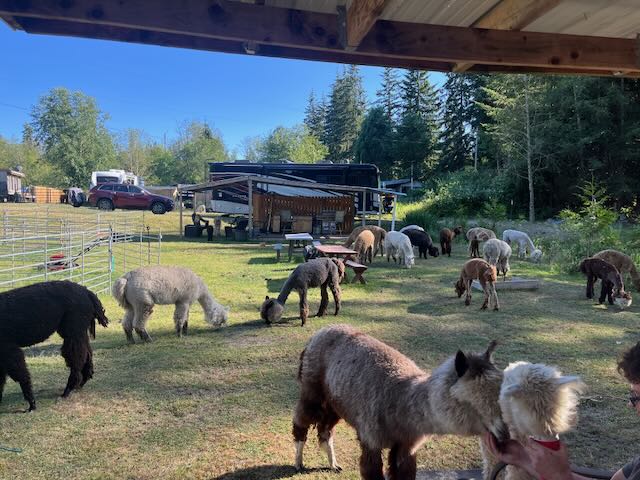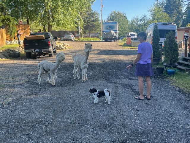 From there we dove southeast to Arlington to another Harvest Host alpaca ranch. This one didn’t hold a candle to the first one. It had a very junky yard and no one who really knew anything about the place ever talked to us…but they had the alpacas – 120 of them and they had the run of the whole place! We looked out the window after we got parked and there were about 30 of them all around WOW. There were also grain pellets out so we could feed them by hand. Paula bought a really cute alpaca T-shirt she says she’ll wear on her bad hair days. But the first ranch was a much better experience because we learned so much about them.
