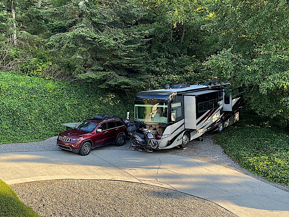 Susie gave us great directions but when we saw how steep their driveway was, we drove on by and disconnected the Jeep before taking a stab at it. How steep was it? So steep that the air brakes on WOW would not hold her in place without the brake pedal depressed. Their RV spot didn’t work because our slides wouldn’t clear their fence, but further up the driveway was another level spot that did work well for us. Ken even ran an extension cord to WOW to keep the basics powered. They rolled out the red carpet, telling us to stay as many nights as we desired, use the washing machine, dryer, clothesline (Paula loves the smell of line-dried sheets), relax on the deck overlook Penn Cove…and Susie came up with numerous sightseeing suggestions.