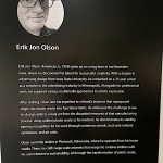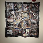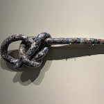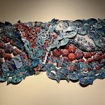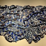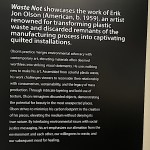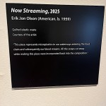 Another collection of art objects was called “Waste Not” by Jon Olson, an artist renowned for transforming plastic waste and discarded remnants of manufacturing processes into captivating, quilted pieces of art.  It looked like quilted fabric but was actually recycled quilted plastic!  Totally beautiful and intriguing!  The piece called “Now Streaming,” represented microplastics in our waterways and subsequently our blood systems.  And all the scraps cut away while making this piece were reincorporated back into the composition.  See more of the collection