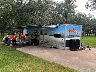 Taking Whisper for a walk later, we came upon a most unusual rig. It sat flush to the ground with a pointed nose and had an unusual wrap on it that said, “Employee Wellness Center.” We stopped and talked with the campers outside playing cards. Tom said, “I bet no one has ever asked about your rig, right?” Can you guess what it was? (Hint: we are in MN where it gets very cold, and it is known as the “Land of 10,000 Lakes.” There are actually 11, 842 lakes of 10 acres or more, but we digress.) Did you guess it? It is an ice fishing trailer. Want one? On wheels, it can hydraulically squat down to sit flush on the ice (or ground). Inside were 10 covered holes about 18” in diameter through which one can auger down through the ice to fish, complete with 2 televisions, one of which showed the fish beneath the surface of the minimum 2’ thick ice. Employees of the company that owned it could sign up to use it and it even came with a truck to tow it. Who knew???