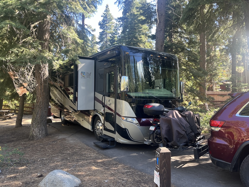From Lassen Volcanic NP, we wanted to go to Lake Tahoe. The closest campsite Tom could find was about 25 miles away in NV. (Perhaps you remember, Lake Tahoe straddles the CA-NV state line.) It was fortuitous to leave CA because it enabled us to fill WOW with diesel in NV and avoid the heavy gas tax in CA. After seeing diesel in CA for as much as $5.75/gal, the posted price at Maverick in NV was $3.70/gal (and with the Maverick app, we pay 10 cents less per gallon than posted)!