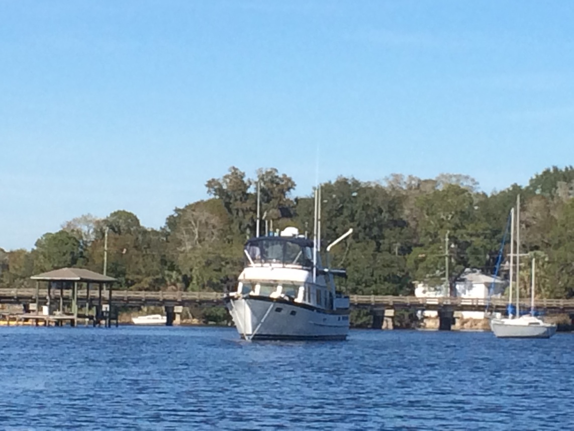 2-5-15 – We woke to a clear, but cold, and windy day. Tom fixed the leak on the generator and we were “anchor up” by 9:30 and headed back out to the magenta line, a line on the nautical chart showing the channel of the ICW. By day’s end, we had moved 36 miles, much of it in “the ditch” – where the ICW is a narrow channel carved out as a shipping waterway. The ditch is continually dredged to ensure the water is deep enough for commercial traffic and we, the recreational boater, reap the benefits. Interestingly, Tom has spent over 30 years working in the Grand Canyon, also often referred to as “the ditch;” and Life’s TraVails travels about 7 to 8 miles per hour, the same as his raft did in the canyon.