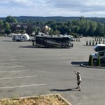 The next 2 days, we were able to begin cleaning WOW.  We had not washed the rig since leaving home and it sure was filthy.  Fortunately, we came through some light rain on our way into town because once there, we could not find a truck wash with a bay tall enough for us (13’).  We had bought a waterless wash-wax system at the RV Expo that promised great things, and we were about to test its truthfulness!  We broke up the chore, washing the top, back and front the first day, using a 1-gallon garden sprayer to wet WOW down and knock off the worst of the dirt.  Then, using the extension pole with microfiber pads and the Wash Wax All product, we went over the coach section by section.  By the time we wiped it with the dry microfiber pad, it was slick and gleaming!!!