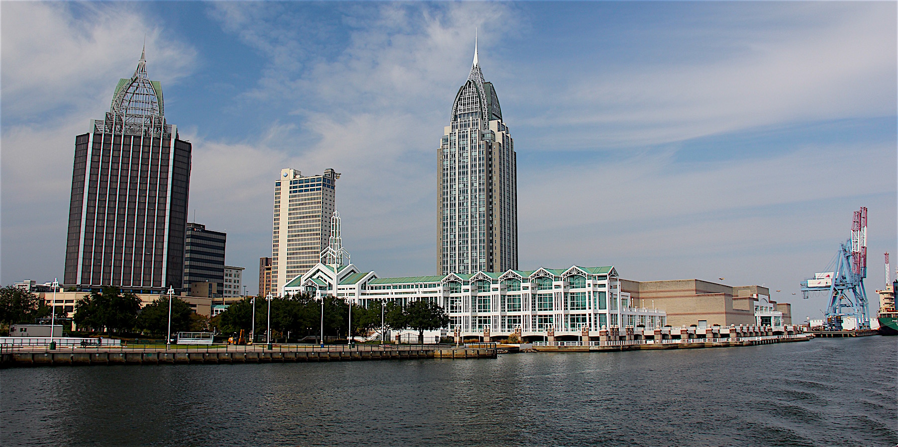 In the morning, we pulled anchor at 6:15 from MM 39 for our final leg to Mobile Bay, MM 0. At MM 6, Mobile’s tall skyline came into view. Paula got on the radio and told the other Tom & Paula, “We aren’t in Kansas anymore!” Indeed we weren’t. Gone were our rustic scenes and quietness along the Tombigbee. The Mobile River delta, an area up to 25 miles wide and 40 miles long, sprawled ahead. It was the widest-open water we had seen since Lake Michigan, 1,250 miles river miles behind us. The harbor was a busy place, the largest port of entry along the southern coast. Each year more than 40 million tons moved through the port, 12th busiest port in US. At MM 3, we passed a fleeting area where barges up to 4 deep for over a mile moved around loading, unloading, making up or breaking down 6-8 barge tows.