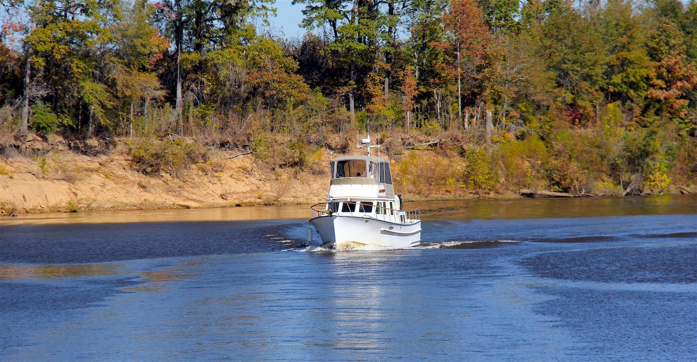 At 5:30 AM Thursday, Tom called the lockmaster to see about locking through at 6:30. There was no known traffic and he said to bring our group on down. At 6:00, 7 boats pulled out of the marina in a line and got through the lock with no wait. The reason for the daybreak departure was because of the long day – about 70 miles. With no more marinas until Mobile Bay, for 250 river miles south, and limited anchorages along the river, overnights had to be chosen wisely and coordinated with other boaters, as the anchorages that did exist were small.