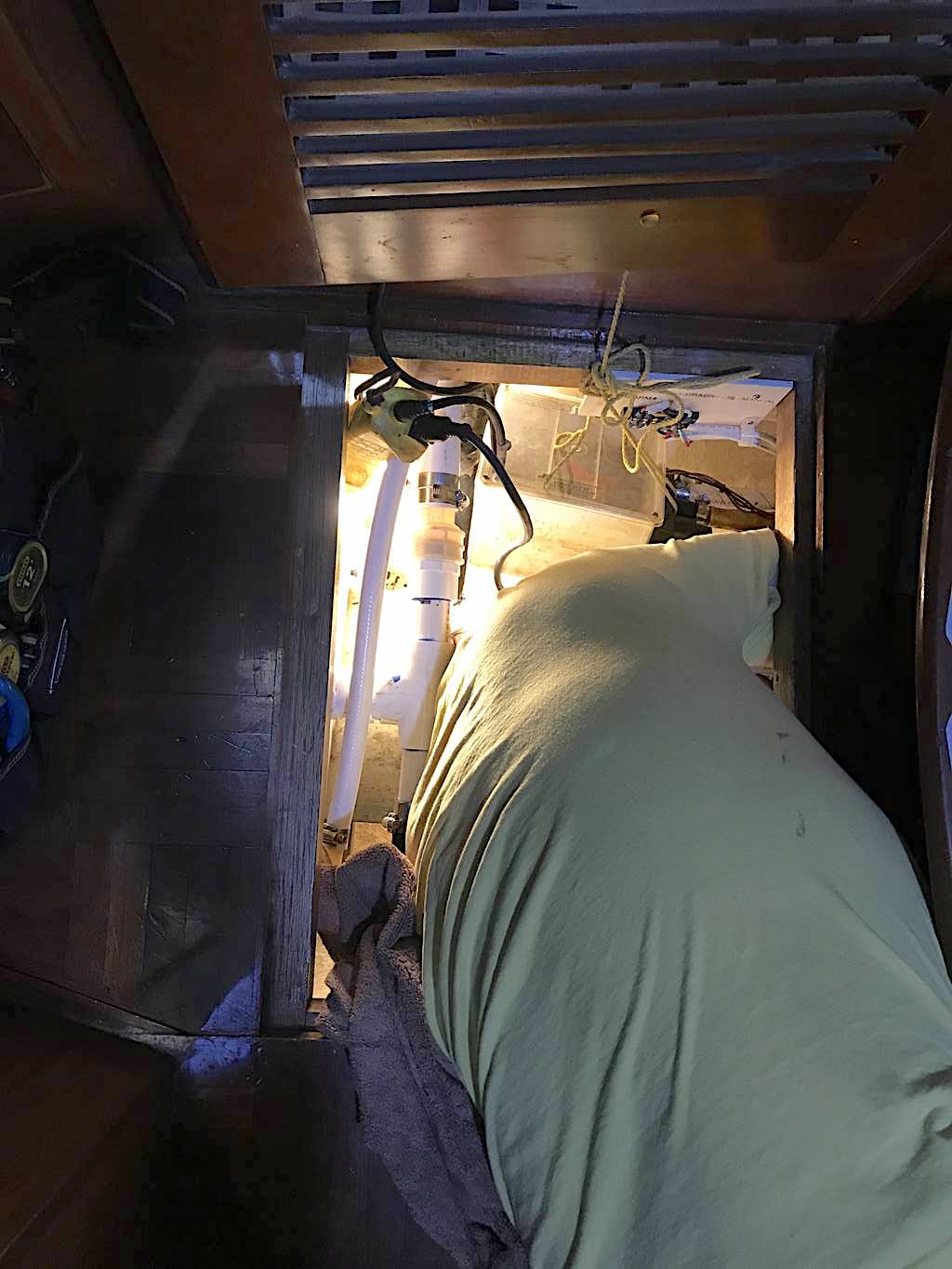 Tom spent the remainder of the day attacking the forward head problem again. He came up with an interesting way to be able to use 2 hands and still not fall into the bilge. He had Paula sit on his legs as a counter-balance…ingenious. He took the processing unit apart, cleaned and tested it. The motors worked!!! He reinstalled it. It didn’t work. Oh well. At least we know now where the problem isn’t. Meanwhile, Paula did laundry and began preparing for our departure.